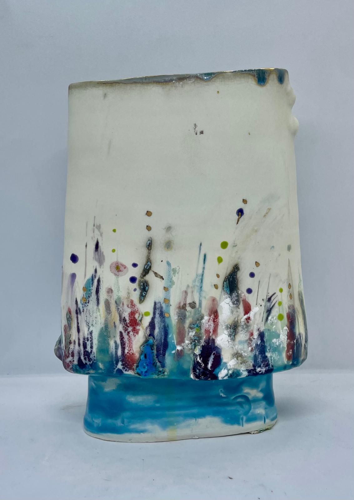 Sonja creates vessels, birds, pendants and plaques using porcelain or stoneware. Decorated by pouring or painting on to the surface with coloured slips, glazes or oxides.